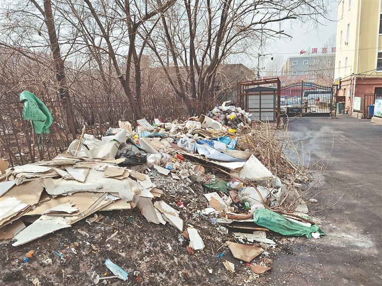 南崗區(qū)學(xué)府路300號至308號之間,是一片改造后的老舊小區(qū),一側(cè)大門還有戴紅袖標(biāo)的人員看守。進(jìn)入后,道路一側(cè)出現(xiàn)了垃圾帶,生活垃圾、裝修垃圾、放棄雜物和殘冰殘雪,堆出了20米的“長龍”。據(jù)這里的居民介紹,小區(qū)沒有物業(yè),衛(wèi)生由街道管理?!坝捎陂L期不外運(yùn),天熱的時候,這里的垃圾會很臭。其實小區(qū)環(huán)境還不錯,就是缺少管理?!?/span>