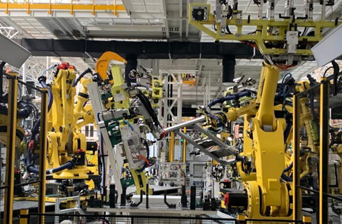 資料圖:江西上饒一家新能源電動(dòng)汽車公司的智慧工廠內(nèi),機(jī)器人正同時(shí)作業(yè)。 李韻涵 攝