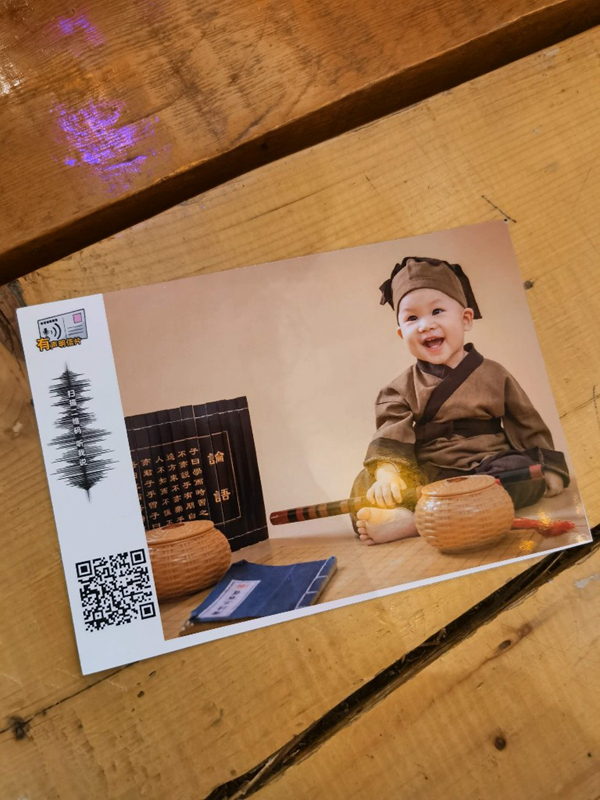 在這里,明信片不僅可以看,還能聽!館內(nèi)富有科技范兒的有聲明信片是最受歡迎的。用手機(jī)上傳照片,錄制一個30秒以內(nèi)的語音,這樣通過機(jī)器打印出來的明信片就有了新功能,只要用手機(jī)掃描明信片上的二維碼,就能聽到專屬寄語。