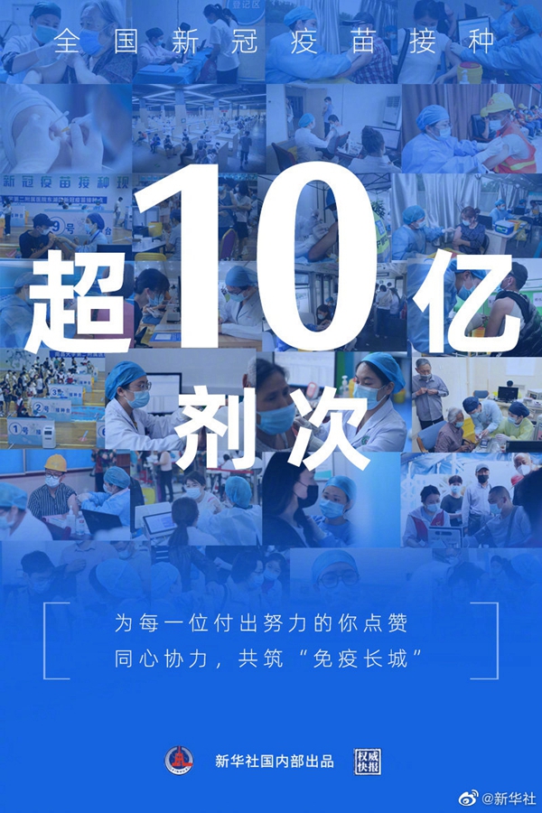 國家衛(wèi)健委6月20日通報(bào),全國新冠疫苗接種超10億劑次,這個(gè)數(shù)字來之不易。這場(chǎng)大規(guī)模接種工作,離不開全國人民的共同努力,預(yù)計(jì)年底前至少70%目標(biāo)人群接種疫苗。疫情形勢(shì)仍然嚴(yán)峻,你我同心協(xié)力,共筑“免疫長城”。(記者陳席元 徐鵬航 海報(bào)設(shè)計(jì) 張晨光)