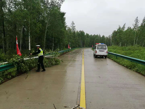 交警大隊(duì)派出警力增援北極中隊(duì),擴(kuò)大巡邏范圍,及時(shí)排查發(fā)現(xiàn)G111、G331國(guó)道、景區(qū)周邊路段交通隱患。在北極村至北紅村路段,發(fā)現(xiàn)由于暴雨沖刷,該路段3處山石、樹枝堆積在路面,2處樹木刮倒,嚴(yán)重影響路面通行安全。巡邏民警立即對(duì)險(xiǎn)情進(jìn)行處置。針對(duì)3處漫水較為嚴(yán)重區(qū)域,設(shè)置警戒線等警示標(biāo)志,告知過(guò)往車輛通行路況,提醒車輛減速慢行,同時(shí)通知相關(guān)部門及時(shí)處置。