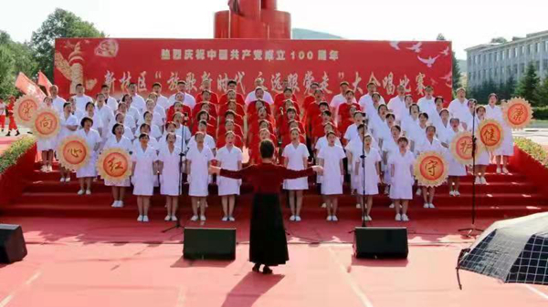 新林林業(yè)局機(jī)關(guān)黨委為現(xiàn)場觀眾展演《沒有共產(chǎn)黨就沒有新中國》《歌唱祖國》。大合唱現(xiàn)場舉行了黨旗傳遞活動,巨幅黨旗經(jīng)過新林區(qū)局黨員干部職工緩緩傳遞。