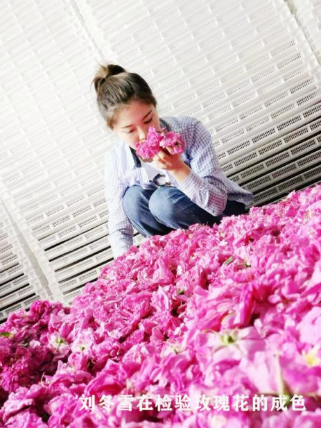今年32歲的劉冬雪,從小就看著外公王占龍帶領(lǐng)父親及家人試種玫瑰花,剛開始種植品種單一,種植面積小,玫瑰產(chǎn)量低。2009年,正在讀高中的劉冬雪,在外公和父親的影響下,加入到玫瑰花種植工作中,幫助老輩管理生產(chǎn)、銷路、產(chǎn)品創(chuàng)新等多個環(huán)節(jié)。劉冬雪有文化、肯專研,女孩子對玫瑰花更是情有獨鐘,父輩一商量將合作社經(jīng)理的重擔就交給了她。劉冬雪深知近年隨著玫瑰面積和產(chǎn)量的不斷提高,他們還是家庭小作坊模式,“單打獨斗”地跑市場,只能是小打小鬧。為此,她跑市場、找銷路、先后到云南、山東等地考察,了解鮮花生產(chǎn)和銷售。并函授學習了林農(nóng)大專課程,不斷更新鮮花品種,提升鮮花品質(zhì),逐步打開了鮮花銷路。劉冬雪也深入思考,只賣原材料經(jīng)受不了市場的考驗,她夢想建一個玫瑰花深加工企業(yè),但是,因缺少資金遲遲沒有實現(xiàn)心中的愿望。