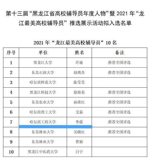 此次活動共評選出“第十三屆黑龍江省高校輔導員年度人物”11名,“2021年龍江最美高校輔導員”10名。哈工程輔導員梁艷艷、李蕊憑借高水平的專業(yè)能力、優(yōu)異的工作業(yè)績以及認真負責的工作精神,在眾多評選者中脫穎而出。