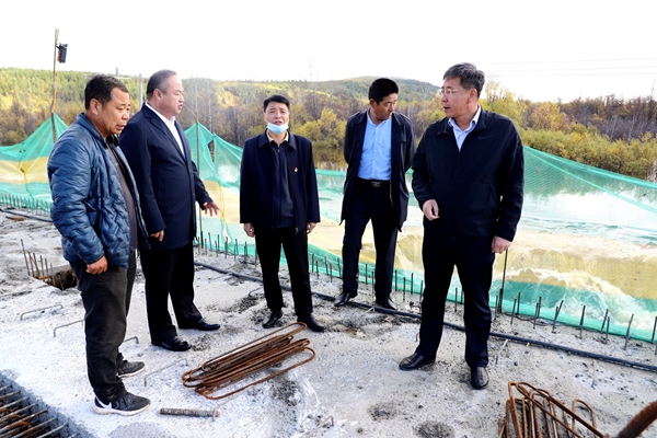 林業(yè)局黨委副書記、局長韓鳳泉(右一)深入在建楚龍溝大橋現(xiàn)場落實泄洪措施,確保國道G111安全。