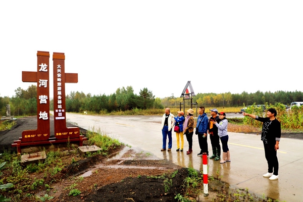 阿木爾林業(yè)局職工、微商何喜燕(右一)向粉絲介紹龍河林場(chǎng)旅游地標(biāo)