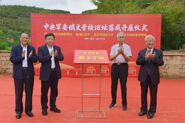 延安革命紀念地管理局黨委書記薛耀軍、黑龍江大學(xué)黨委書記王永清、北京外國語大學(xué)校友總會會長楊學(xué)義工、中央軍委俄文學(xué)校校長曾涌泉之子曾建為中央軍委俄文學(xué)校舊址展覽揭牌。