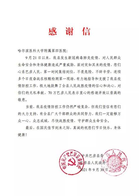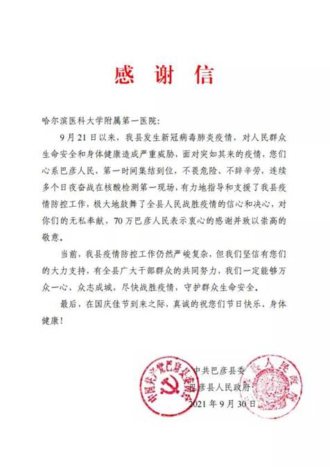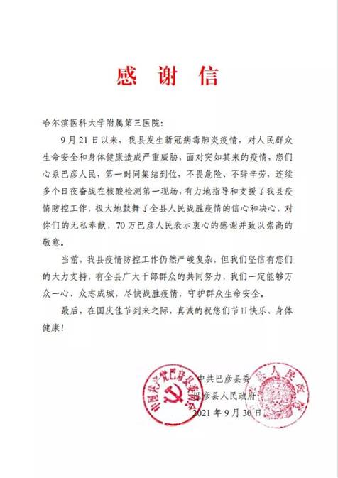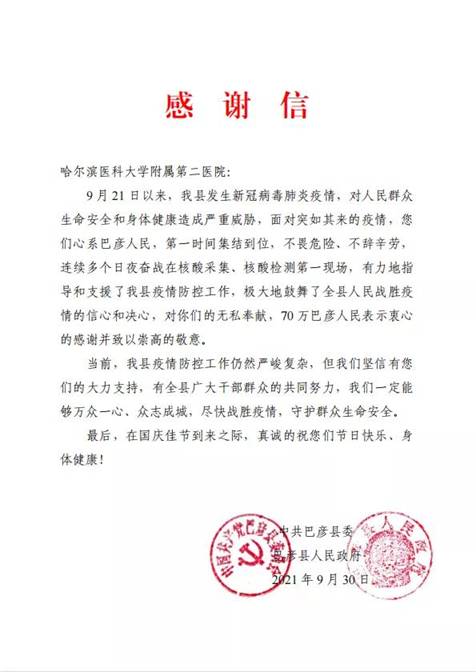黑龍江經(jīng)濟網(wǎng)訊(黑龍江日報全媒體見習(xí)記者董廣碩 商祺)近日,哈爾濱醫(yī)科大學(xué)附屬一院、二院、腫瘤醫(yī)院、四院分別收到巴彥縣委縣政府的感謝信,感謝他們“有力地指導(dǎo)和支援了我縣疫情防控工作,極大地鼓舞了全縣人民戰(zhàn)勝疫情的信心和決心?!?/span>