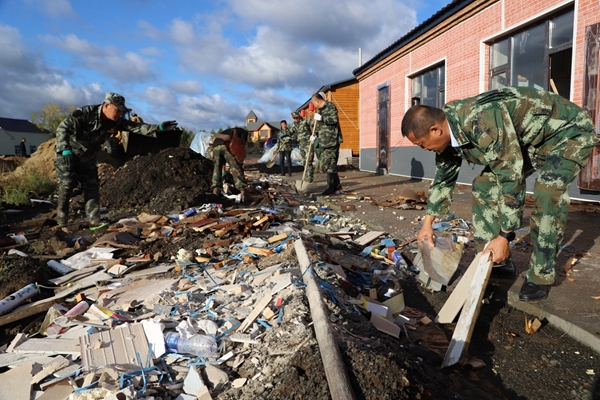 圖為阿木爾林業(yè)局龍河林場(chǎng)黨員干部職工清理精品民宿房前的建筑垃圾。王力 攝
