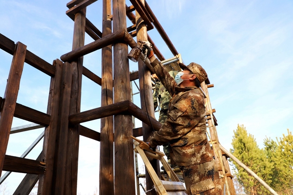 圖為阿木爾林業(yè)局黨員干部職工為興安林場(chǎng)精品民宿大門(mén)“美顏”,為安裝“得勝營(yíng)”牌匾做準(zhǔn)備。王力 攝