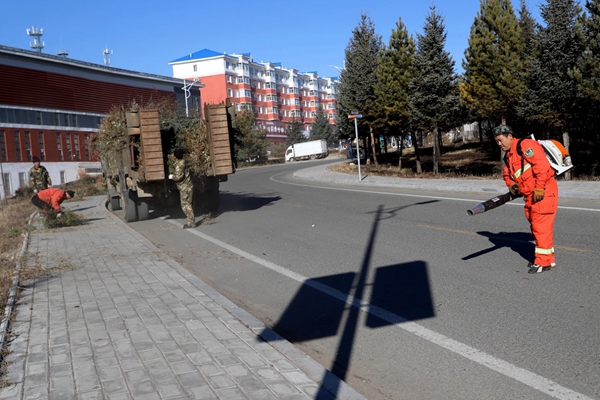 圖為阿木爾林業(yè)局森林消防大隊(duì)專(zhuān)業(yè)撲火隊(duì)員利用風(fēng)力滅火機(jī)將林海路路面上的碎石塵埃清除干凈(王力/攝)