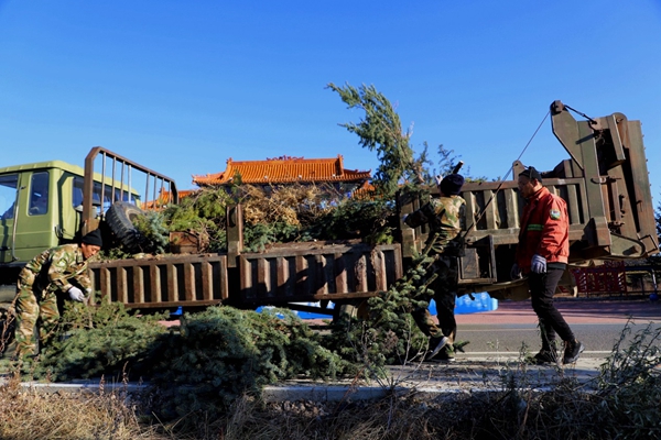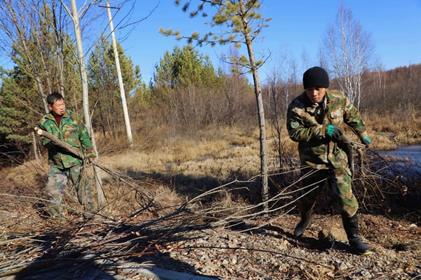 圖為阿木爾林業(yè)局森林消防大隊(duì)專(zhuān)業(yè)撲火隊(duì)員將修剪下來(lái)的樹(shù)枝裝車(chē)運(yùn)走(王力/攝)