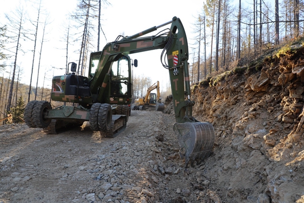 圖為阿木爾林業(yè)局多種經(jīng)營公司干部職工利用鉤機機械設(shè)備開挖2—1線新開通線路邊溝(王力/攝)