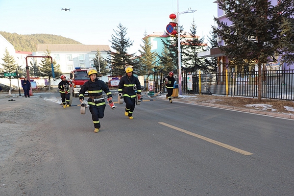 阿木爾公安城鎮(zhèn)消防大隊(duì)?wèi)?zhàn)斗員演練雙干線三支水槍