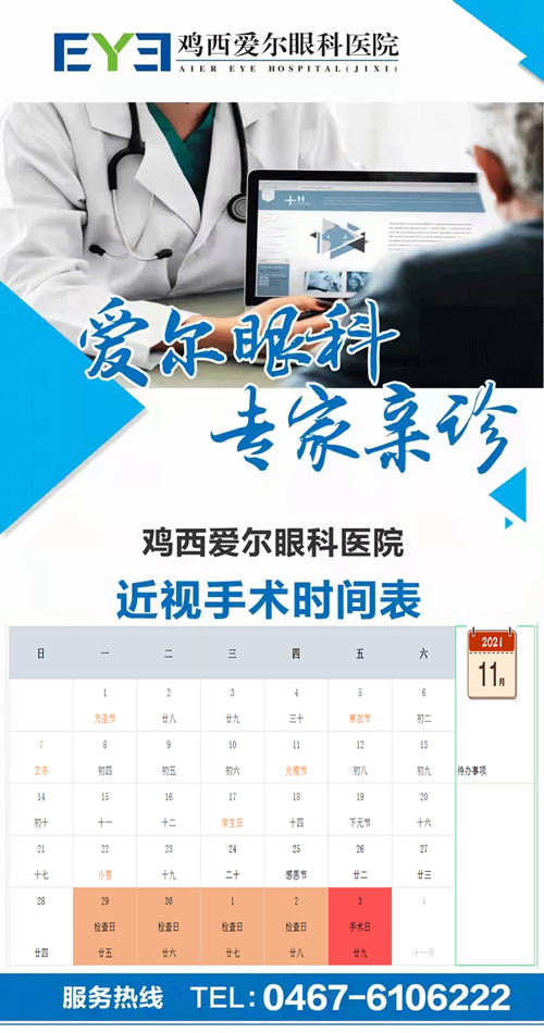雞西愛爾眼科醫(yī)院近視手術時間表: