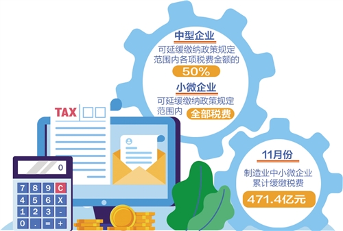 剛剛過去的11月是制造業(yè)中小微企業(yè)階段性稅收緩繳政策實施首月。12月1日,國家稅務總局發(fā)布統(tǒng)計數(shù)據(jù)顯示,這項政策實施效果顯著,制造業(yè)中小微企業(yè)已累計緩繳稅費471.4億元。