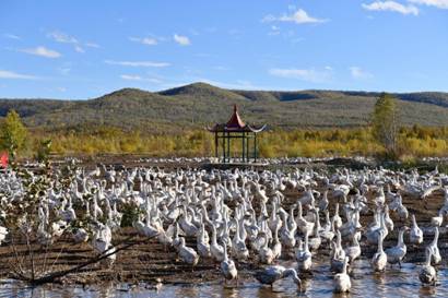 新林林業(yè)局依托當?shù)厮葚S美的生態(tài)環(huán)境優(yōu)勢,扶持開展“生態(tài)鵝”養(yǎng)殖項目,為職工開拓了增收致富的新途徑(崔紅霞 攝)