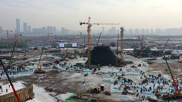 記者在哈爾濱冰雪大世界園區(qū)建設(shè)現(xiàn)場看到,工人們有序地忙碌著,塔吊、叉車、鏟車等各種機械設(shè)備在緊張作業(yè),工人切冰、鏟冰的聲音與作業(yè)機械的轟鳴聲,在園區(qū)內(nèi)交織成一首“建設(shè)交響樂”。