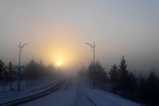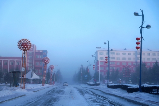 早晨7點(diǎn)30分,阿木爾林業(yè)局天剛蒙蒙亮,遠(yuǎn)處的群山不見了蹤影,籠罩在寒霧當(dāng)中,附近的建筑物影影綽綽,仿佛仙境一般,這種寒霧天氣被百姓成為“冒白煙”。