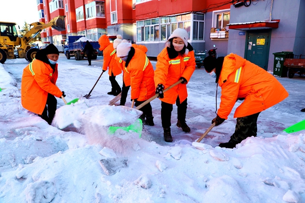 阿木爾林業(yè)局環(huán)衛(wèi)隊職工清理居民樓前硬化地面積雪,喜迎新春佳節(jié)(王力 攝)
