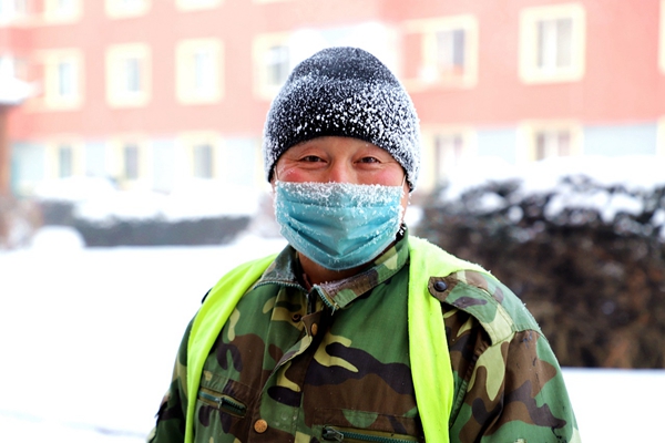 阿木爾林業(yè)局環(huán)衛(wèi)隊職工單廣躍冒嚴(yán)寒清理生活垃圾,口罩、帽子上結(jié)滿冰霜(王力 攝)