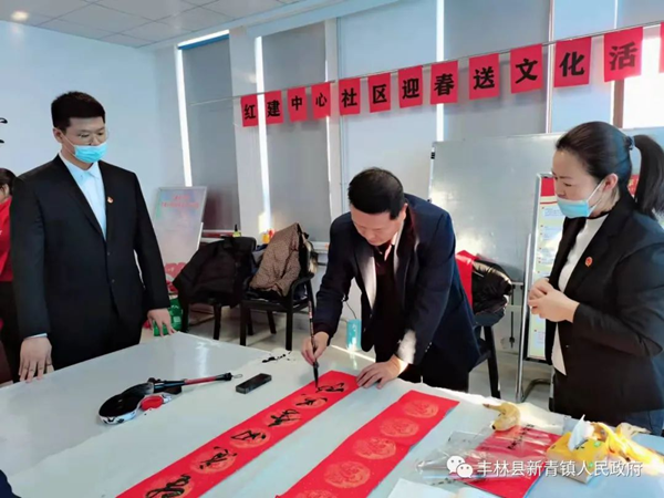 1月18日,豐林縣文聯(lián)邀請了該縣書法家協(xié)會會員及書法藝術(shù)愛好者6人,深入到新青鎮(zhèn)所轄社區(qū)現(xiàn)場為居民書寫并贈送春聯(lián)和福字。在新青鎮(zhèn)紅建社區(qū),書法家們揮毫潑墨,奮筆疾書,紅幅鋪展、妙句成雙,滿室濃墨飄香,到處洋溢著春的氣息。