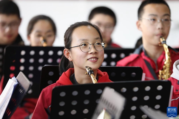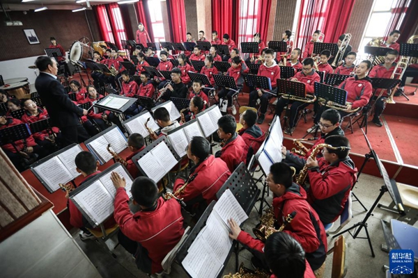 2022年寒假,在甘肅省白銀市會寧縣,會師中學(xué)交響管樂團(tuán)的孩子們在完成寒假作業(yè)之余排練《紅旗頌》。早在2011年,會寧縣會師中學(xué)就東挪西借組建了第一個交響樂樂團(tuán)。平時,學(xué)校為樂團(tuán)的學(xué)生免費上樂器課,學(xué)生自愿報名參加、自愿購買小型樂器。如今,《紅旗頌》《長征組歌》等已成為樂團(tuán)的保留曲目。
