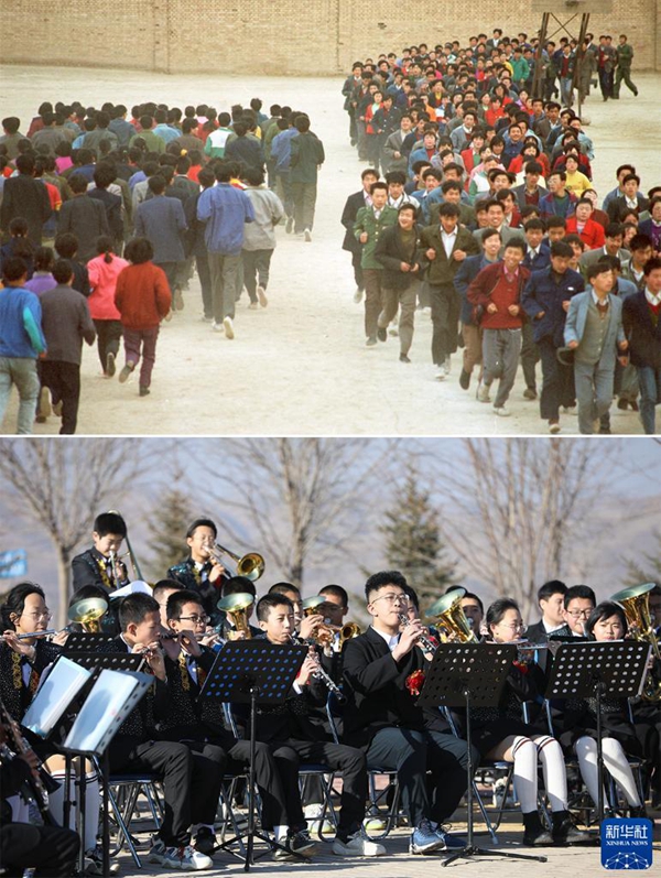 拼版照片:上圖為2001年,會寧縣二中學(xué)生跑步鍛煉身體(新華社記者 武斌 攝);下圖為2022年1月19日,會寧縣會師中學(xué)交響管樂團(tuán)學(xué)生在戶外表演交響樂(新華社記者 馬希平 攝)。