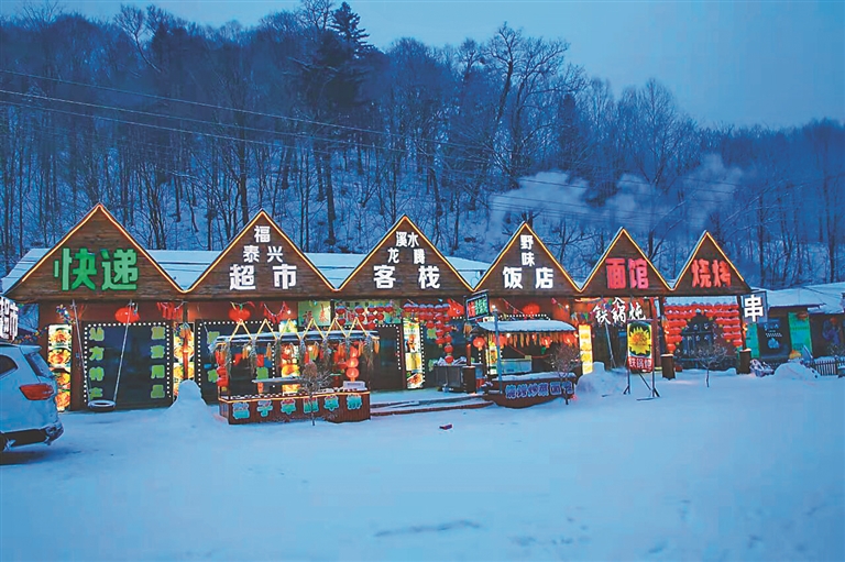 當(dāng)我們抵達(dá)雪谷的時(shí)候,暮色已濃,天地間覆蓋了一片黑色的幕布。但雪谷中心街道上,聳立著由上千只大紅燈籠排列組合的拱形門(mén),燈火輝煌,延續(xù)百米開(kāi)外。門(mén)的頂端中央鑲嵌著“中國(guó)雪谷”四個(gè)金色大字,格外醒目。我們停下車(chē)拍照,并就近住宿,溫暖的火炕讓我們很快進(jìn)入夢(mèng)鄉(xiāng)。