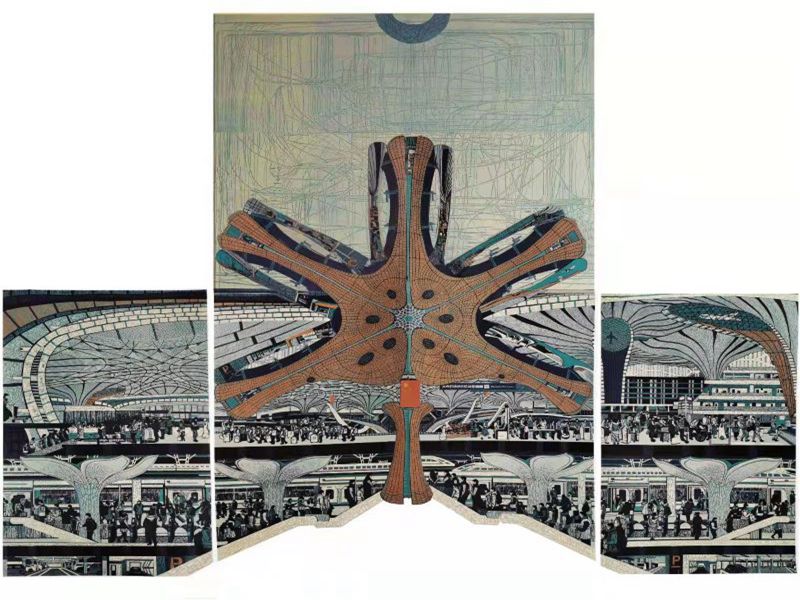 版畫(huà)作品《鳳凰展翅——北京大興國(guó)際機(jī)場(chǎng)》描繪了北京大興機(jī)場(chǎng)如鳳凰展翅、騰飛天際的恢宏景象。畫(huà)家采用空間翻轉(zhuǎn),將機(jī)場(chǎng)內(nèi)外現(xiàn)代化、人性化、藝術(shù)化的先進(jìn)設(shè)施和繁忙的國(guó)際交流同時(shí)表現(xiàn)出來(lái)。
