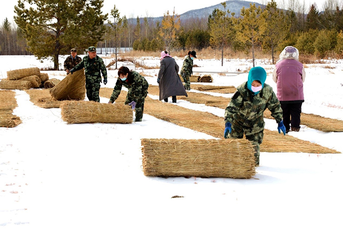 一年之計(jì)在于春。林業(yè)局中心苗圃針對(duì)興安落葉松、樟子松、西伯利亞紅松新播苗因受凍拔影響,導(dǎo)致苗木根部留露地面而枯死的實(shí)際問(wèn)題,組織機(jī)關(guān)工作人員利用周末兩天時(shí)間,以義務(wù)獻(xiàn)工,對(duì)180萬(wàn)余株苗木鋪蓋草簾子近5000延長(zhǎng)米。