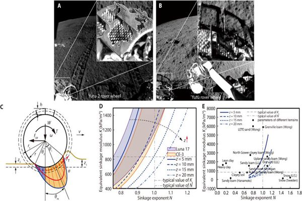 團(tuán)隊(duì)成員根據(jù)月球車車輪與月面作用的信息和地面力學(xué)模型估計(jì)了月壤的力學(xué)特性,結(jié)果表明,月壤風(fēng)化層的承壓特性與地球上的干沙和沙壤土類似,與美國阿波羅計(jì)劃中的典型月壤相比具有更強(qiáng)的承壓特性。在多個(gè)不同地點(diǎn)的圖像中,觀察到“玉兔二號(hào)”車輪粘附有大塊團(tuán)狀土壤,而“玉兔號(hào)”車輪基本不存在粘土現(xiàn)象,這表明,嫦娥四號(hào)著陸區(qū)附近月壤內(nèi)聚力較大,其原因可能是包含較高比例的凝集物,使土壤顆粒經(jīng)車輪碾壓更易團(tuán)聚。