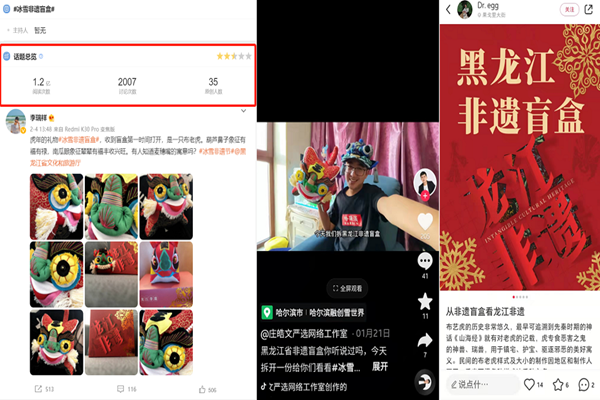 “黑龍江冰雪非遺盲盒”是省文旅廳在第二屆冰雪非遺節(jié)期間,依托黑龍江省豐富的非物質(zhì)文化遺產(chǎn)資源,推出的創(chuàng)意營銷活動。活動期間,甄選了陳氏布藝、樺樹皮畫、剪紙、鰉魚等黑龍江非遺產(chǎn)品,涵蓋了藝術(shù)品、美食等多種品類,通過官方微博及微信公眾平臺策劃線上招募“非遺體驗官”、非遺問答游戲等多種形式活動,隨機發(fā)放盲盒,充分展示了龍江非遺的獨特魅力。