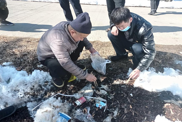 大烏蘇林場(chǎng)干部職工在市場(chǎng)集中區(qū)清撿煙頭(汝愛(ài)麗 攝)