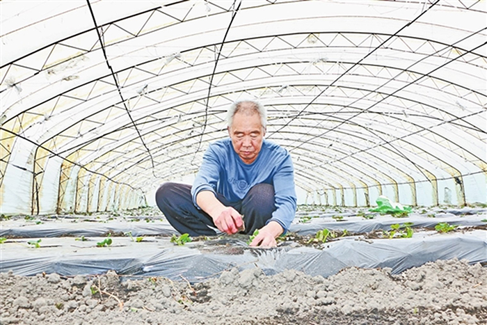 王明會(huì)在大棚內(nèi)侍弄著草莓秧,預(yù)計(jì)6月初草莓就可以上市了。孟大春 攝