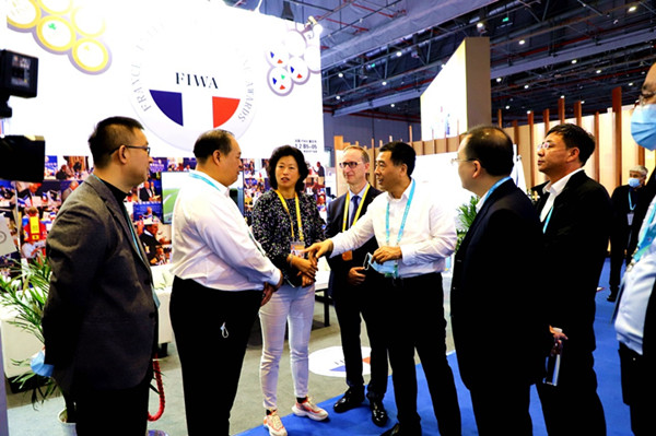 阿木爾林業(yè)局北極冰藍(lán)莓酒莊生產(chǎn)的冰酒、紅酒等產(chǎn)品,在第四屆上海國際進(jìn)出口博覽會(huì)上展出。大興安嶺林業(yè)集團(tuán)公司黨委副書記、總經(jīng)理李軍(左五)與國際友人及林業(yè)局參展人員親切交談,了解酒莊產(chǎn)品特點(diǎn)、市場(chǎng)營(yíng)銷等情況(王力 攝)