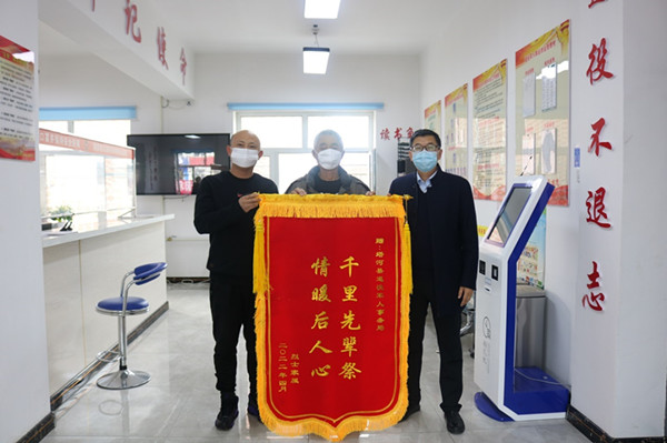 離開(kāi)塔河前,老人拿著錦旗來(lái)到縣退役軍人服務(wù)中心。他表示,此行受到工作人員如家人般的接待十分暖心,對(duì)陵園的管理非常認(rèn)可和感謝。時(shí)隔55年,跨越3300多公里,安邦勤老人終圓夢(mèng)。