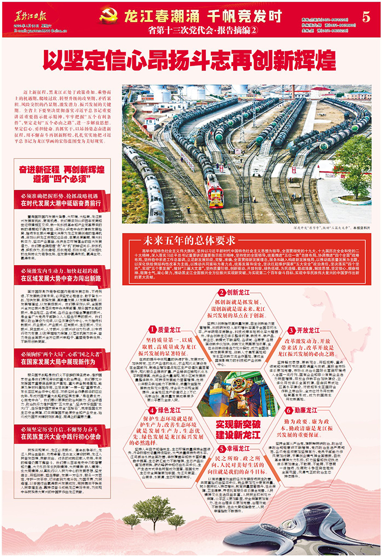 邁上新征程,黑龍江正處于政策疊加、乘勢而上的機遇期,爬坡過坎、轉(zhuǎn)型升級的攻堅期,矛盾累積、風險交織的凸顯期,激發(fā)潛力、振興發(fā)展的關鍵期。全省上下要堅決貫徹落實習近平總書記重要講話重要指示批示精神,牢牢把握“五個有利條件”,堅定走好“五個必由之路”,進一步解放思想、堅定信心、勇?lián)姑?、真抓實干,以昂揚姿態(tài)奮進新征程,用不懈奮斗再創(chuàng)新輝煌,扎扎實實地把習近平總書記為龍江擘畫的宏偉藍圖變?yōu)槊篮矛F(xiàn)實。
