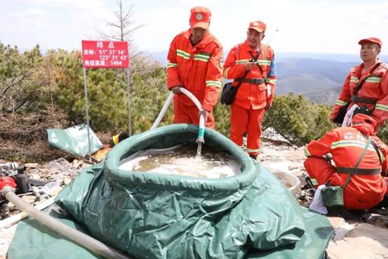 據(jù)了解,此次演練模擬小白山最高峰海拔1404米的“興安第一塔”附近偃松林發(fā)生火情,在海拔886米尋找到一處水源地,撲火隊員利用高揚程山地引水泵向1150米處放置的儲水囊供水,同時架設第二臺水泵向山頂供水,兩臺水泵交叉接力成功將水引向小白山最高峰,噴淋“興安第一塔”,整個過程鋪設水帶全長3740延長米,垂直爬高519米。