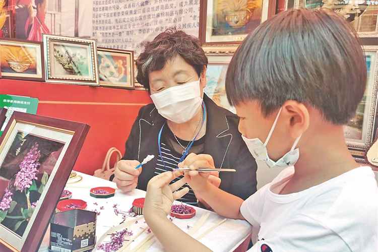 國家級非遺項(xiàng)目——麥稈剪貼技藝傳承人馬文俠教孩子制作紫丁香。黑龍江日報全媒體記者 荊天旭攝
