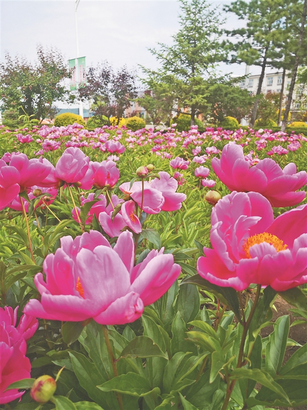 沿著公路,中藥材種植基地呈現(xiàn)一片花海:大片芍藥已經(jīng)開(kāi)花,白的粉的隨風(fēng)飄搖;千畝黃芩都已經(jīng)3歲,仿佛綠蘿緞一直蔓延到遠(yuǎn)方的山坡;萬(wàn)畝沙棘谷,更像一幅水墨畫,剛露頭的沙棘果盡顯萌態(tài);樹(shù)下間作的蒲公英盛開(kāi)著黃色的小花;紫的泛黑的藍(lán)靛果吸引一群群鳥(niǎo)兒不停來(lái)啄食……