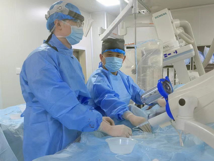 “患者入院后雖進(jìn)行了快速靜脈溶栓,但病情依然進(jìn)展性加重,我們發(fā)現(xiàn)患者病情為顱內(nèi)主干血管閉塞導(dǎo)致,情況十分危急,如果不及時(shí)介入開通閉塞的顱內(nèi)大血管,一旦錯(cuò)過治療最佳時(shí)機(jī),患者就可能會(huì)出現(xiàn)危及性命等情況。”毛鐵副主任醫(yī)師回憶了當(dāng)時(shí)搶救情景。搶救刻不容緩,在爭(zhēng)得家屬同意并簽字后,神經(jīng)介入團(tuán)隊(duì)立即將張先生送至導(dǎo)管室進(jìn)行介入取栓治療。
