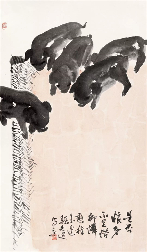 湯文選的人物、山水、花鳥(niǎo)、墨虎等一系列作品,融會(huì)著、貫穿著“三種傳統(tǒng)”?;螂[或顯,或化解之,或凝聚之,或熔裁之,或獨(dú)造之。“三種傳統(tǒng)”,可概括為現(xiàn)實(shí)主義在中國(guó)畫(huà)發(fā)展歷程中的三段式,亦曰交叉出現(xiàn)的不同歷史內(nèi)涵、文化反映的三種藝術(shù)狀態(tài):首先,是古代現(xiàn)實(shí)主義傳統(tǒng)——“外師造化,中得心源”。其二,是“五四”現(xiàn)實(shí)主義傳統(tǒng)——融合西法,崇尚寫(xiě)實(shí)。其三,是新中國(guó)成立后倡導(dǎo)的革命現(xiàn)實(shí)主義傳統(tǒng)。深入火熱斗爭(zhēng),深入工農(nóng)兵。學(xué)習(xí)延安木刻,學(xué)習(xí)民間年畫(huà),學(xué)習(xí)蘇聯(lián)油畫(huà)現(xiàn)實(shí)主義的創(chuàng)作方法(50年代)。其后,“一手伸向生活,一手伸向傳統(tǒng)”(60年代)。在以上“三種傳統(tǒng)”的交匯點(diǎn)上,伸延出湯文選早期和中期的現(xiàn)實(shí)主義創(chuàng)作之路。湯文選中國(guó)畫(huà)藝術(shù)的現(xiàn)實(shí)主義,其主要特征為積極的入世態(tài)度,強(qiáng)烈的人文主義色彩,個(gè)性、民族性與時(shí)代性的完美統(tǒng)一,以及嚴(yán)肅的歷史使命感。