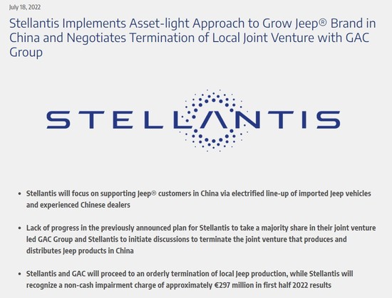 7月18日,Stellantis集團(tuán)發(fā)布公告稱,正在與廣汽集團(tuán)協(xié)商終止合資公司廣菲克的經(jīng)營(yíng),并將有序停止Jeep品牌的國產(chǎn)化;未來,Stellantis將通過進(jìn)口的方式獨(dú)自在中國銷售、經(jīng)營(yíng)Jeep產(chǎn)品。