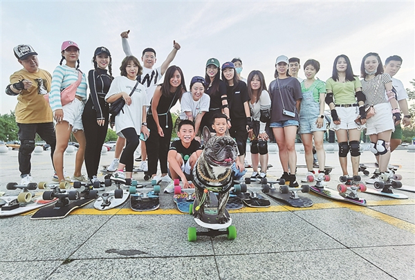 7月21日18時許,太陽島地鐵站出口附近的小廣場,一群人抱著陸沖板陸續(xù)趕到,其中“80后”“90后”居多,還有帶孩子來的“寶媽”。不少人來的時候穿著上班的職業(yè)裝,換上圓領(lǐng)T恤,戴上鴨舌帽,配齊護(hù)具,簡單熱身后,迫不及待地開滑。