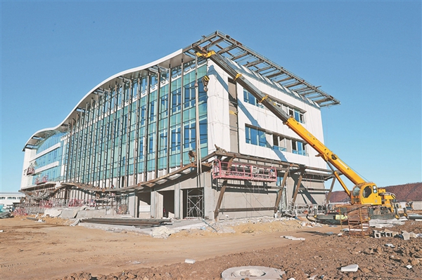 臨近立冬,黑河市氣溫已降至零下。在黑河市愛輝區(qū)上馬場鎮(zhèn),黑河寒區(qū)試車高新技術(shù)產(chǎn)業(yè)園項(xiàng)目仍在緊張建設(shè)。起重機(jī)吊起外墻造型鋼架,工人們在腳手架上拿著焊槍緊張作業(yè)。