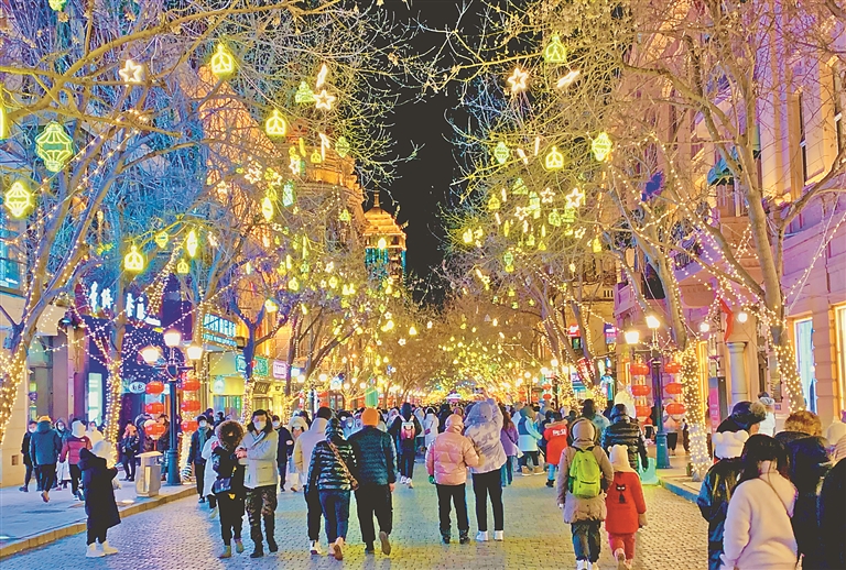 穿過歐式建筑,滿滿冰城風(fēng)情的彩燈以及年味十足的大紅燈籠將哈爾濱中央大街點(diǎn)亮。2023年新年伊始,百年老街呈現(xiàn)出游人如織的火熱場(chǎng)面,熟悉又熱鬧的氣氛彌漫在老街的各個(gè)角落,煙火氣持續(xù)升騰。欣賞唯美的陽臺(tái)音樂秀,品嘗鍋包肉、馬迭爾冰棍等特色美食,打卡“星空燈”、“雪妮妮網(wǎng)紅兔子”雪雕……游客和市民沉浸在一個(gè)個(gè)融合創(chuàng)意與冰城特色的冰雪玩法和體驗(yàn)之中,盡情享受冰雪帶來的歡樂。數(shù)據(jù)顯示,僅春節(jié)期間,中央大街日均客流量維持在40萬人次,高峰時(shí)期達(dá)到70余萬人次。