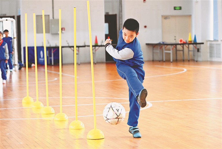 在首日訓練營上記者看到,孩子們在教練員的指導下,先進行熱身訓練,原地高抬腿、拉伸、活動關(guān)節(jié)后,進入足球基本訓練環(huán)節(jié)。孩子們被教練員分成四組,每組進行折返跑,運球過桿、射門等專項素質(zhì)、專項技術(shù)訓練。訓練中,教練員隨時糾正孩子們不標準的動作,并對每個孩子進行綜合素質(zhì)評分。最后,孩子們被分成兩組進行小場地對抗比賽,剛才還有板有眼進行訓練的孩子瞬間變成足球小將,如脫韁的野馬在場地上奔跑、拼搶,盡情體驗校園足球帶來的專屬快樂。比賽結(jié)束后,孩子們意猶未盡,對這種形式的足球訓練營紛紛點贊,并對接下來的培訓課充滿期待。
