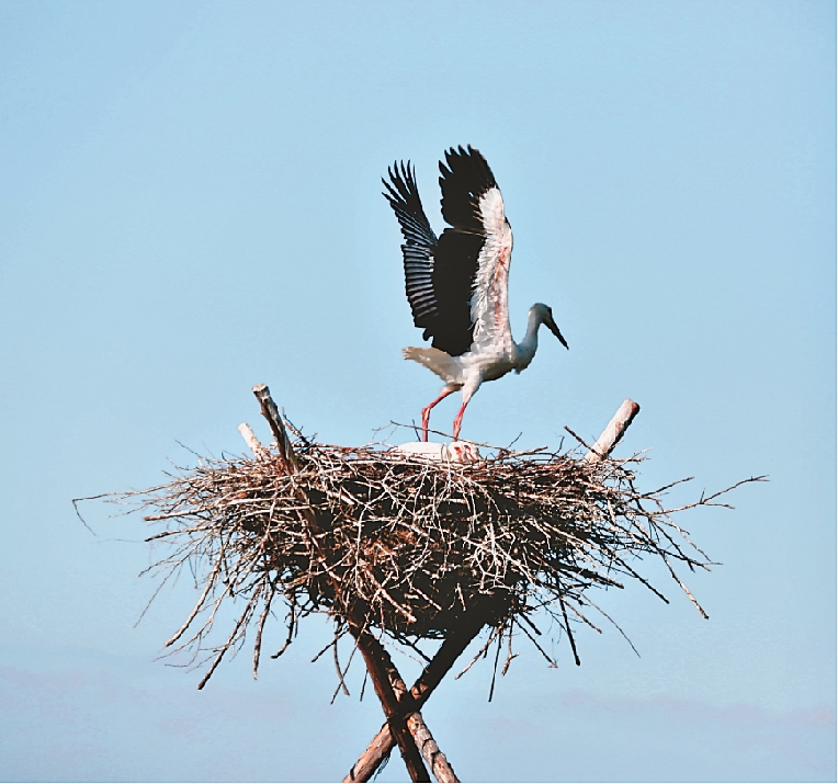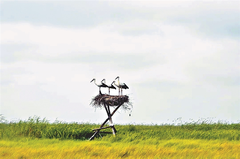走進保護區(qū)內,翠綠豐茂的水草之下河水潺潺流動,不時有東方白鸛從高空飛到河邊覓食。這里雖然少有人類活動的痕跡,但為東方白鸛高高筑起的人工招引巢隨處可見。