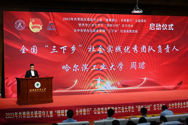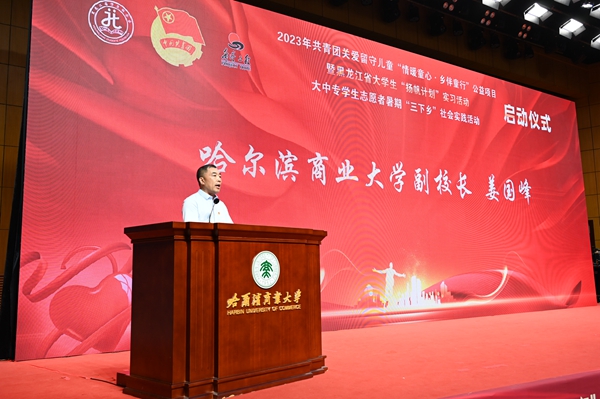 本次活動,在哈爾濱商業(yè)大學的大力支持下順利開展,哈爾濱商業(yè)大學副校長姜國鋒在儀式上致辭,他說:“學校建校71年來,立足立德樹人根本任務,聚焦‘為黨育人,為國育才’的職責使命,在不斷加強‘第一課堂’建設的同時,還依托學?!惑w兩翼’文化育人模式,充分發(fā)揮實踐育人的作用,通過開展‘三下鄉(xiāng)’‘返家鄉(xiāng)’等社會實踐和‘西部計劃’‘興邊富民’志愿服務項目,引導廣大青年學生堅持用習近平新時代中國特色社會主義思想凝心鑄魂,在社會的課堂中‘受教育、長才干、作貢獻’?!被顒蝇F場,播放《黑龍江省希望工程30年與光同行》和黑龍江省大中專學生志愿者暑期“三下鄉(xiāng)”社會實踐活動宣傳片,與會領導上臺共同啟動了“情暖童心·鄉(xiāng)伴童行”公益項目、大學生“揚帆計劃”實習活動、大中專學生志愿者暑期“三下鄉(xiāng)”社會實踐活動。